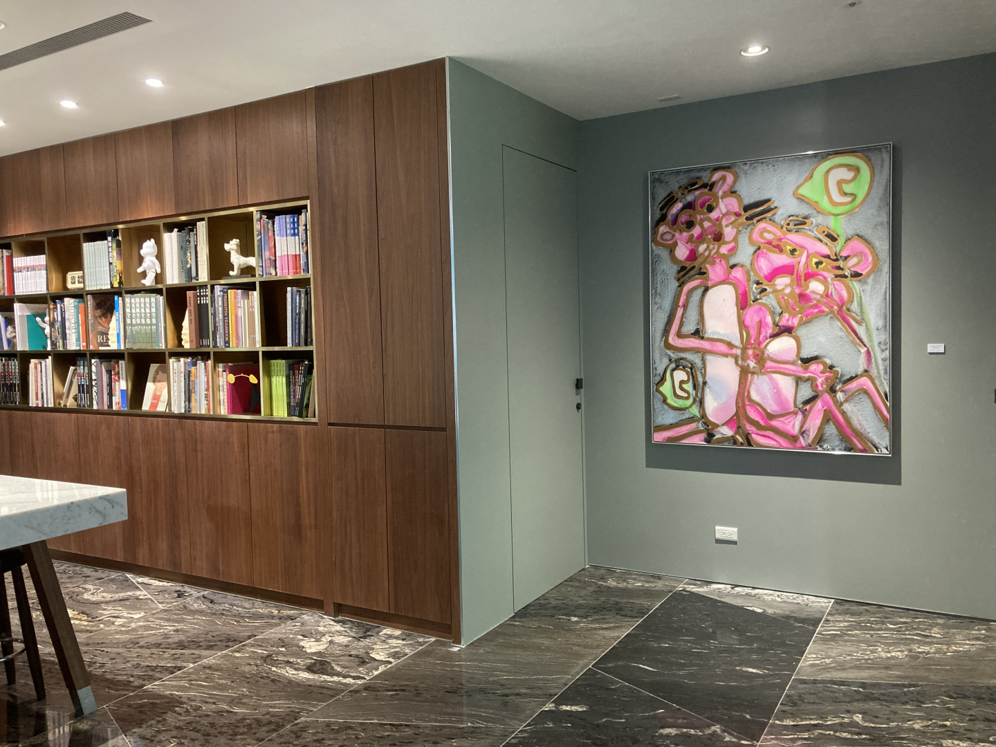 Katherine Bernhardt Hamburger Bacon Black Olive and Mushroom with Salted Caramel Pretzel Concrete and Hi Fi Fo Fum, Greenberg Gallery, Saint Louis, MO